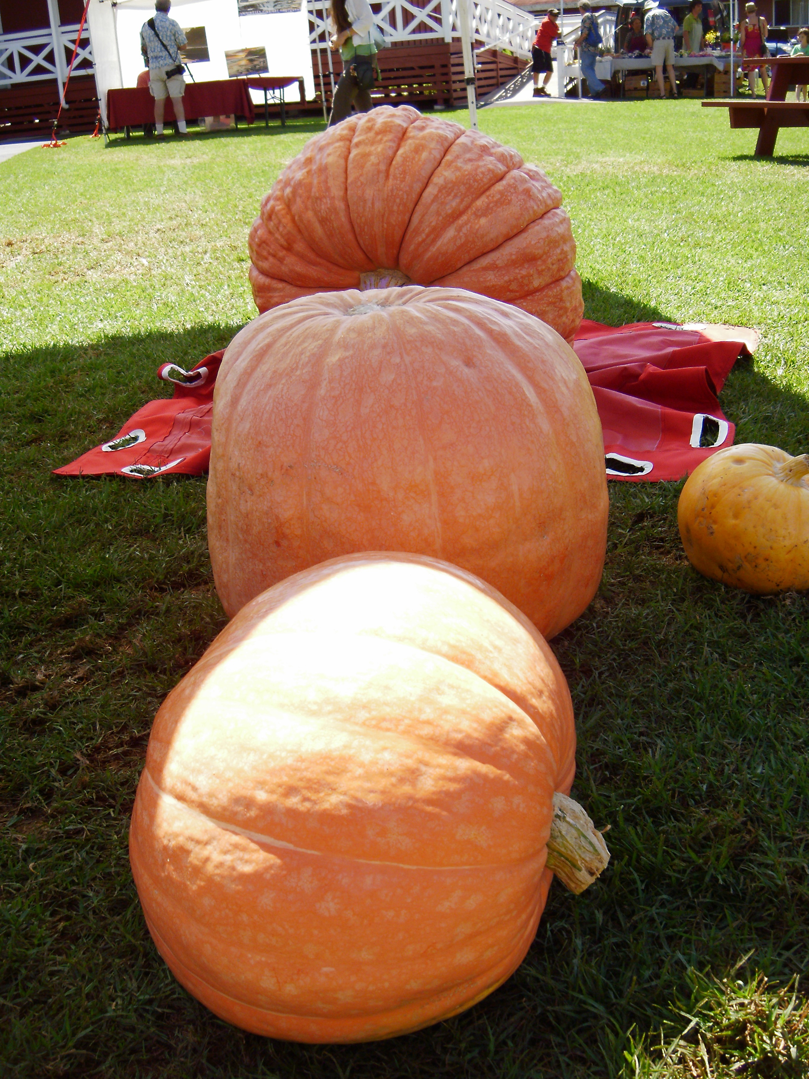 Young Kawika Winters himself weighed in at only 1/2 a pound more than the giant pumpkin that he grew. Here he awaits the judging flanked by the other contenders.